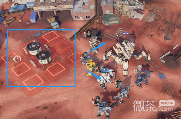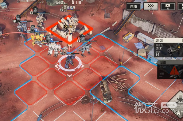 第二回合开始后,系统会提示BOSS要释放火箭突袭,这个技能后续每隔几回合都会释放,但都会有提示。同时,火箭突袭的范围圈在地面上也会显示,是九宫格图形,需要我们在火箭突袭回合的我方先手行动时,把范围内的机兵逐渐位移开。
