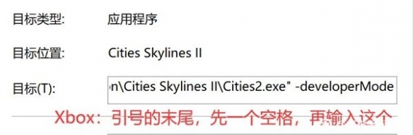 2.Xbox或学习版:打开天际线2的安装文件夹,找到Cities2.exe,右键,创建快捷方式。再右键快捷方式,编辑它的属性,找到“目标”一栏,在目标的末尾先打一个空格,再加上-developerMode,然后打开快捷方式进入游戏。空格是必须的,否则会报错。目标地址应该如下图所示。
