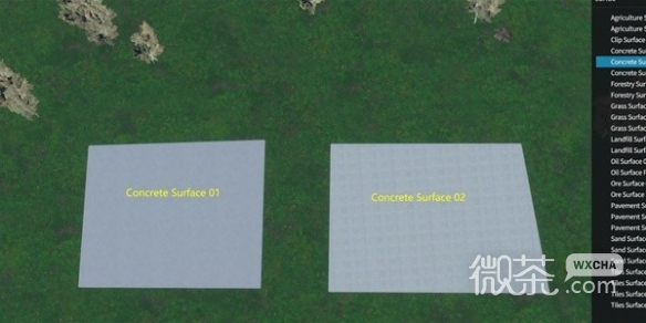 使用Debug UI可以完成一代模组Surface Painter给地面刷水泥的功能。按Home后,搜索concrete,有两种水泥地可以使用,如下图所示。和多边形划区一样,你只需要用多边形来刷地就行了,可以直接放在建筑底下,比如给一整个小区的范围刷上水泥。