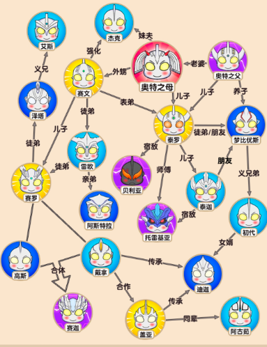 3、塞罗徒弟是泽塔,,义兄为艾斯,梦比优斯的兄弟为初代,女婿为迪迦,迪迦传承盖亚和戴拿,盖亚同辈为阿古茹。
