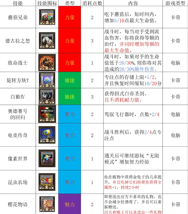 电子游戏需在床上进行游玩,行动会消耗游戏机的电量,卡带随着游玩会不断补货。一共七盘卡带。旋转方块T为购买游戏机时赠予。