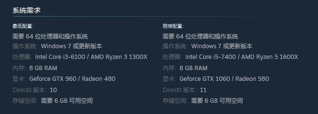 处理器: Intel Core i5-7400 / AMD Ryzen 5 1600X