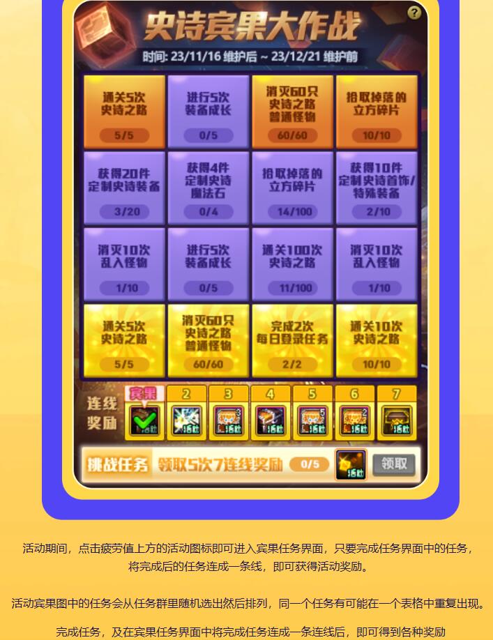 活动内容介绍: 1、活动期间,点击疲劳值上方的活动图标即可进入宾果任务界面,只要完成任务界面中的任务,将完成后的任务连成一条线,即可获得活动奖励。 2、活动宾果图中的任务会从任务群里随机选出然后排列,同一个任务有可能在一个表格中重复出现。完成任务,及在宾果任务界面中将完成任务连成一条连线后,即可得到各种奖励一、宾果任务大连线