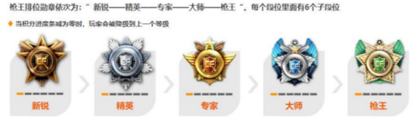 3、大段位依次分为:新锐-精英-专家-大师-宗师-传奇-枪王-荣耀枪-荣耀之巅-枪王之王。