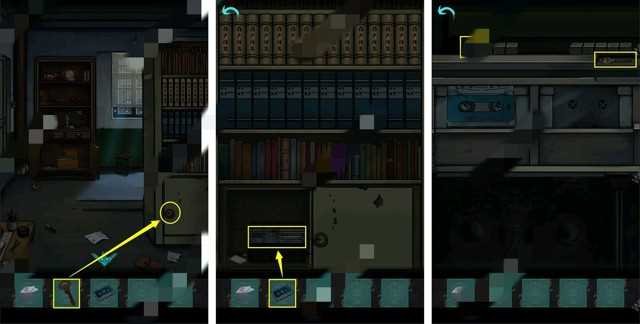 20、用钥匙打开资料架柜门,把磁带放收音机里。按下左边按钮,拿到钥匙。