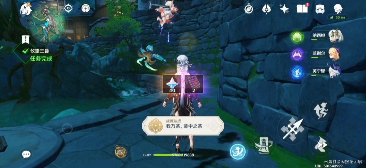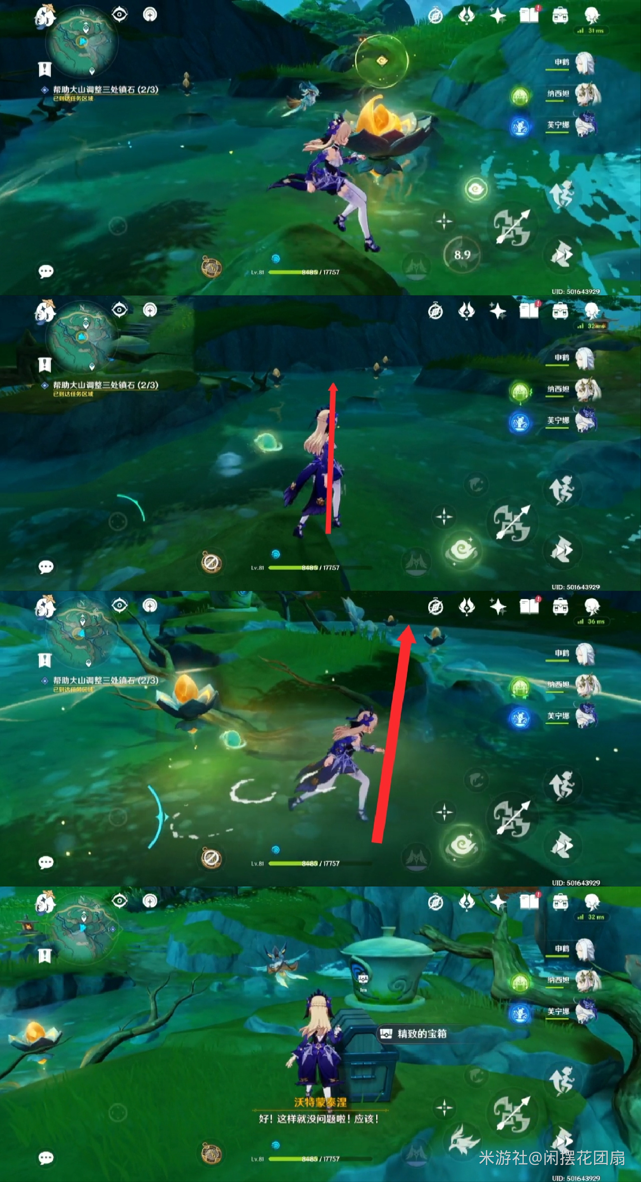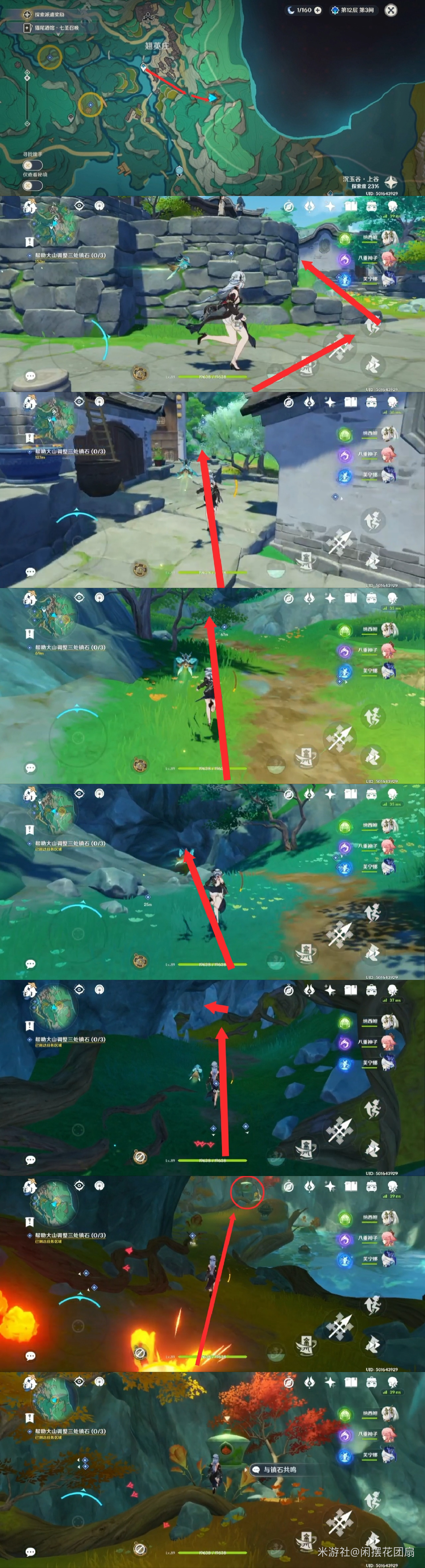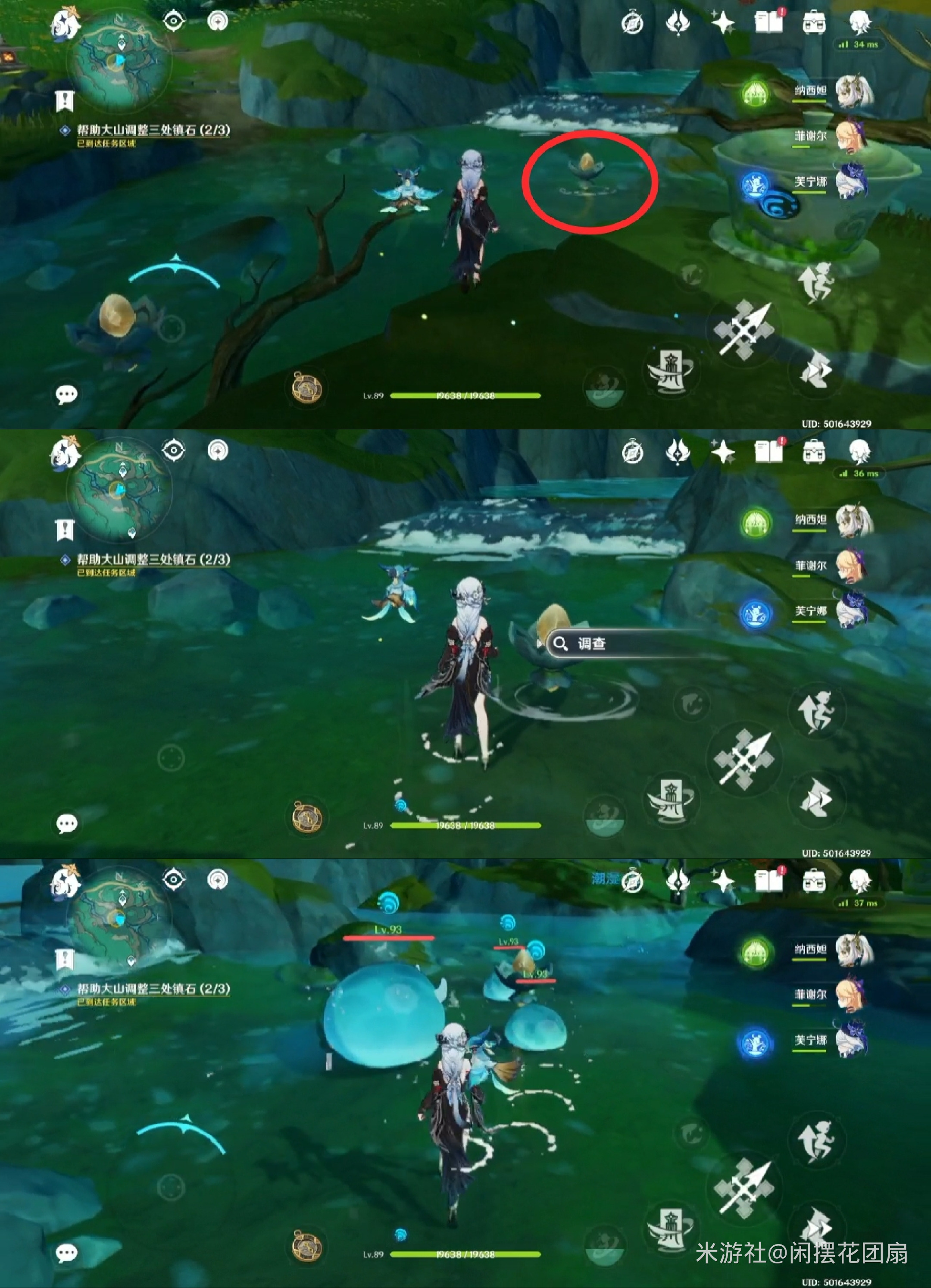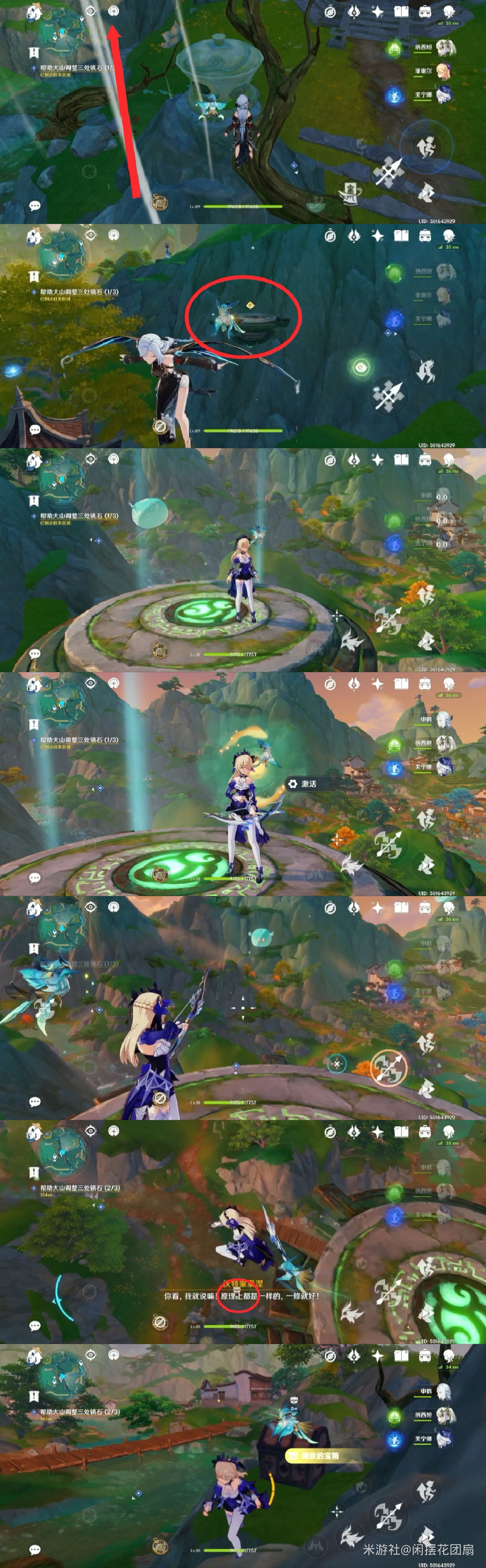与镇石共鸣,出现许多莲花灯,调查圈住的那个莲花灯(底部有涟漪的),击败出现的水史莱姆