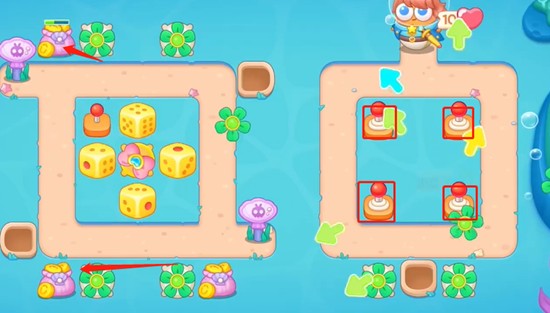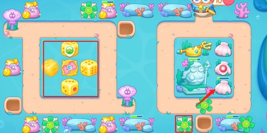 2、这中间的箱子给的是蝴蝶结,打掉以后我们在中间继续放置骰子增加导出,然后开始清理右侧位置的道具。