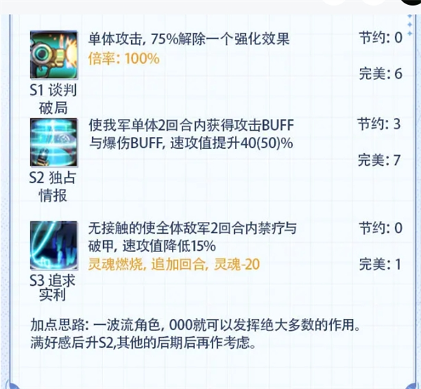 PVE强度5分:虽然具有破甲、攻击BUFF、爆伤BUFF、驱散等效果,但是还是略逊与别的统PVE角色,PVE的强度并不是太高。