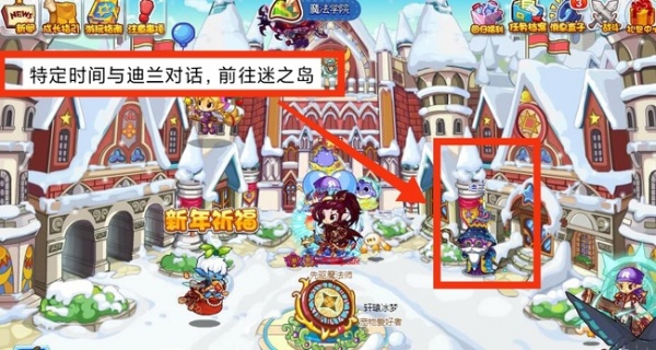 在场景中找到迪兰,在开放时间和NPC迪兰进行对话就可以前往迷之岛。