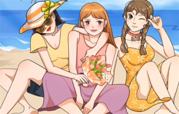 2、点击粉包获得道具,把太阳帽和墨镜给左边的女生带上,鲜花也拿给左边的女生。