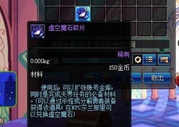 4、使用虚空魔石可以扩大玩家的金库,还可以用来完成一些天界任务。