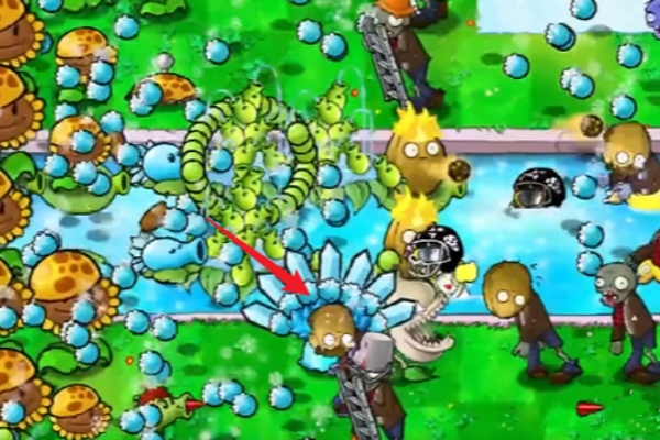 4、然后选择血量较多的僵尸的地方放置雪花寒冰菇。