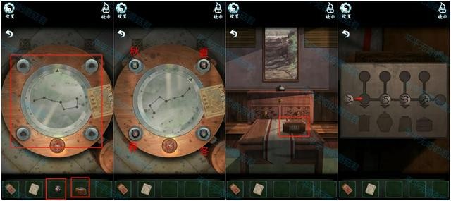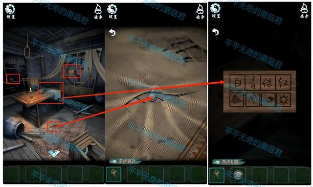 二、跟着提示来到左侧房间:点击下图的四个位置,点击照片获得要茶房钥匙,点击地板获得圆形按钮,点击盒子获得火柴