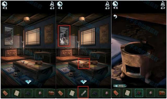 六、随后要钥匙开启茶房,点击第一张图屏风位置,获得密码【3957】开启下图柜子的密码,获得木碳,再点击中间图位置的照片位置,或是密码【左右左左右左】,解开福字的门锁,获得【茶宠】,茶宠,是放进倒满水的被子中