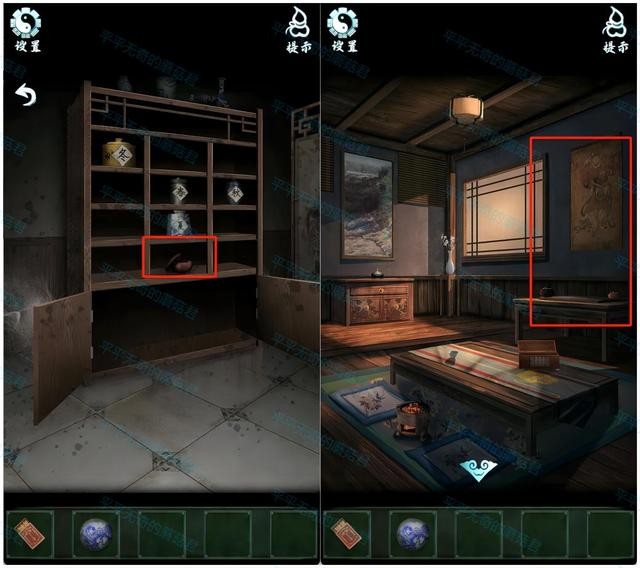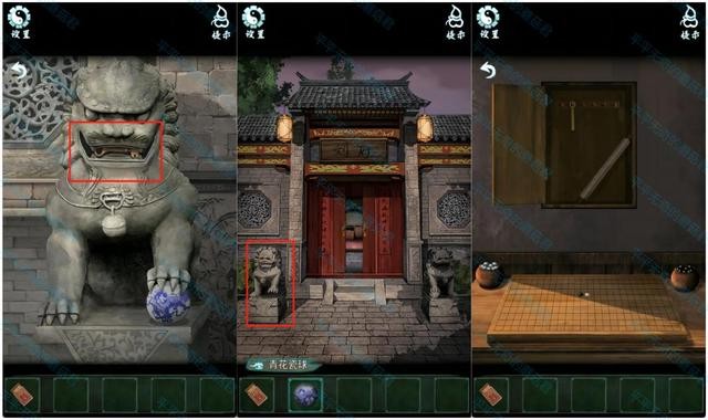 十、以后带着青瓷球,来到门口,放进左边石狮子爪子下,获得钥匙,开启上一步对弈后烧毁的画后的柜子里。获得【正屋的钥匙】跟一幅画,后边要用到。