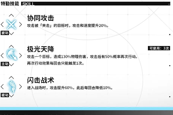 2、主动技能极光天降,攻击一个目标,造成130%物理伤害,攻击后有50%概率再次行动。