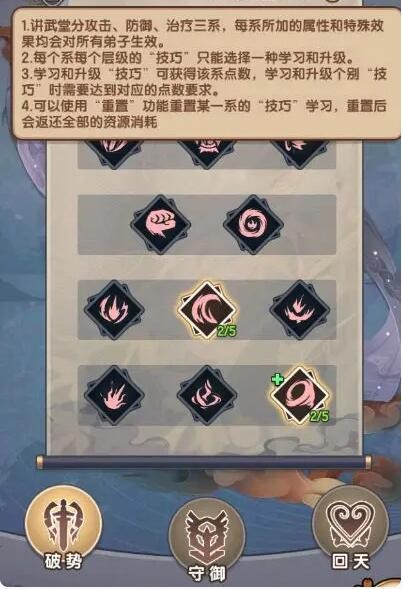 很多人在讨论建不建这个建筑,我建议是一定要建的。因为讲武的属性是对全弟子都有加成的。讲武分为3部分(破势、御守、回天),可以简单的理解为点3个技能树。讲武越到后期加成越多,终极技能更是BUG级的存在(图四)。