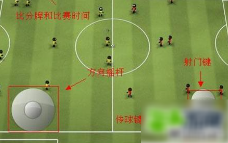 游戏左上角分别是比分牌和游戏时间。左下角是一个摇杆型的方向控制键。右下角在玩家控时分别为射门和传球。与传统的足球游戏一样,射门和传球键按得越久传球和射门的力量也会越大。
