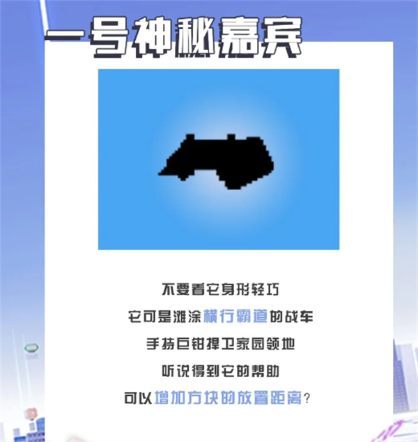 1、一号神秘嘉宾,身形轻巧,滩涂横行霸道的战车,手持巨钳捍卫家园领地,听说得到它的帮助,可以增加方块的放置距离。