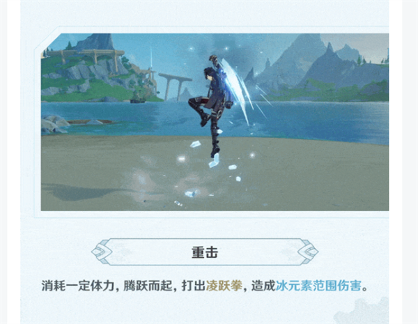 重击:消耗一定体力,腾跃而起,打出凌跃拳,造成冰元素范围伤害。
