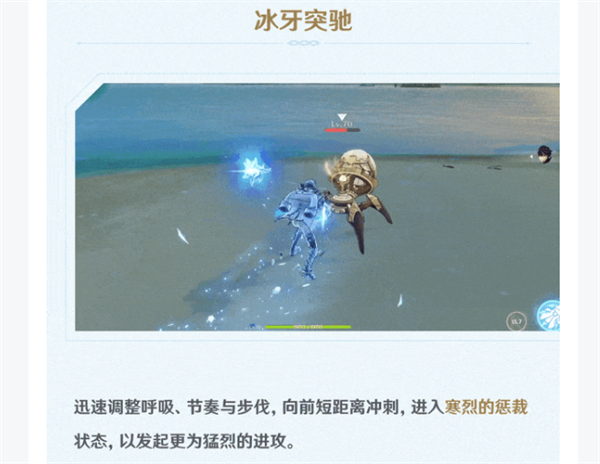 元素技能·冰牙突驰:莱欧斯利迅速调整呼吸、节奏与步伐,向前短距离冲刺,进入寒烈的惩裁状态,以发起更为猛烈的进攻。