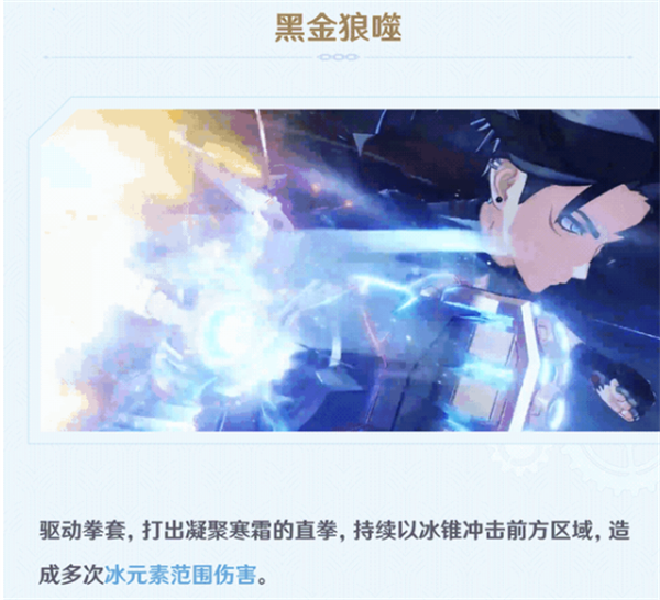 终极技能·黑金狼:莱欧斯利驱动拳套,打出凝聚寒霜的直拳,持续以冰锥冲击前方区域,造成多次冰元素范围伤害。