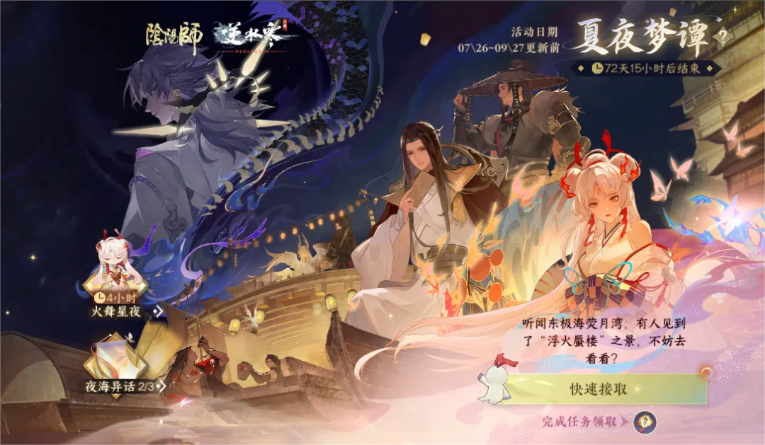 听闻东极海荧月湾,有人见到了浮火蜃楼之景,各位同门不妨前往一探!完成任务可分别结识异世友人【因幡辉夜姬】、【不知火】,并获得称号【百鬼夜话晓阴阳】。