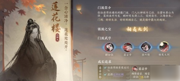 6、紧跟引导直至加入:遵循游戏中给出的系列指引和任务链,直至顺利完成所有加入莲花楼的前置任务。在整个过程中,始终保持与莲花楼相关的任务进度,不要中途离开或者加入其他门派。