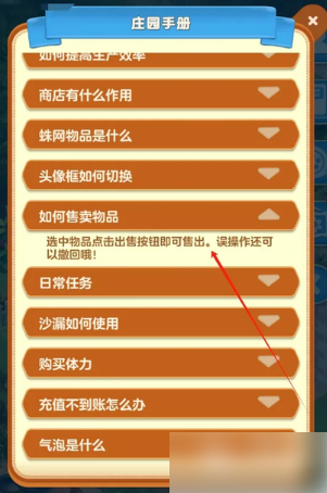 在这个庄园手册中,你会看到一个相关的选项,也就是“如何售卖物品”。然后点击这个选项,系统将会为你展示具体的操作指示。我们可以看到,只要选中物品,然后再点击出售按钮,就能够把物品售卖出去了。假如是操作失误卖出去了,也还可以操作撤回,可以说是非常方便了。