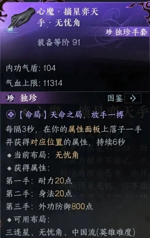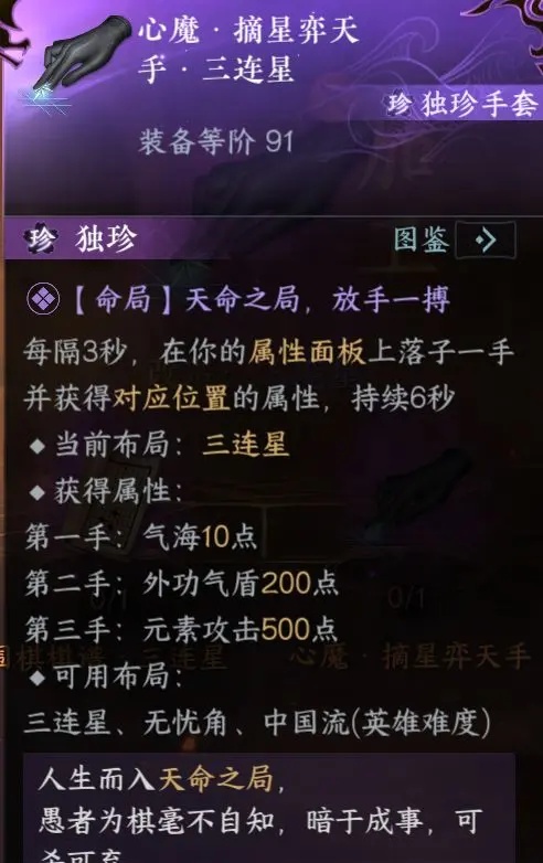 得到【摘星弈天手·三连星】与【摘星弈天手·无忧角】这两款升级后的装备,诸位可选择更适合自己的装备升级佩戴。