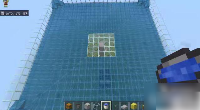 2、之后在Y坐标为158格的地方建造一个23×23的平台,平台四周有两格高的围墙,四周放水冲刷怪物,需要注意的是要从角落数第三格开始放水,不然会形成无限水,中间的洞口是让怪物掉下去的。