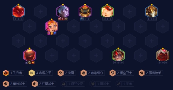 羁绊:4命运之子 2炎魔 2咖啡甜心 2堡垒卫士 2强袭枪手 2重装战士 2狂暴战士