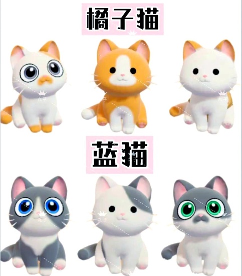 其中包含橘子猫、蓝猫、玳瑁猫、熊猫猫、三花猫、奶牛猫。