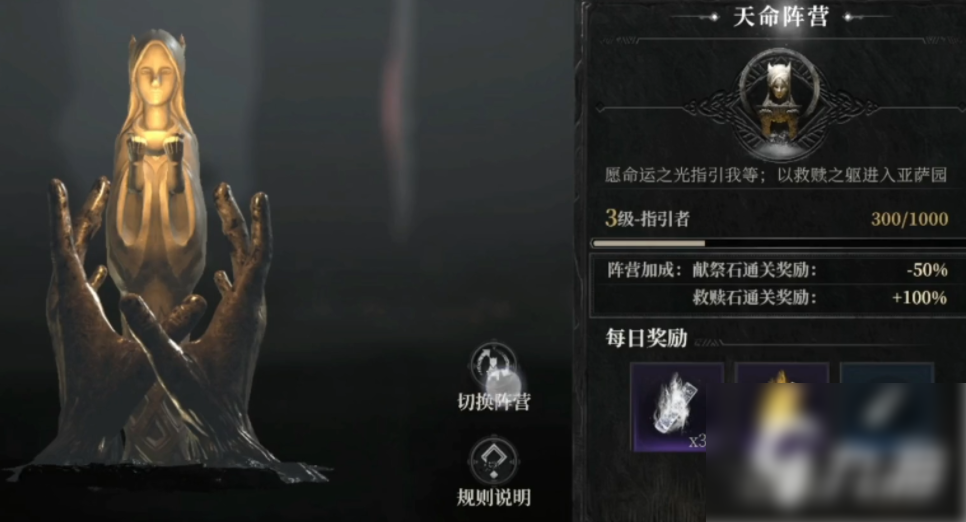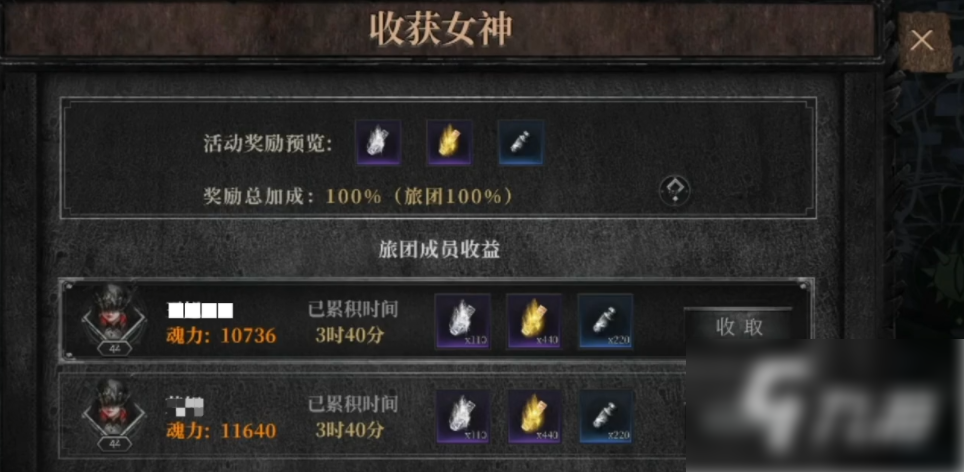 在一些对战场景中也会有这样的石碑,并且这里的功能会更丰富一些,大家如果在这个地方的挂机时长达到指定程度之后,便可以领取到对应的奖励。此地比较有特色的设定就是能够帮助同旅团中的其他玩家收奖励。