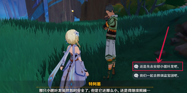 2、接取任务后跟随指引和npc特阿墨对话,然后选择“还是先去安慰小匿叶龙吧”。