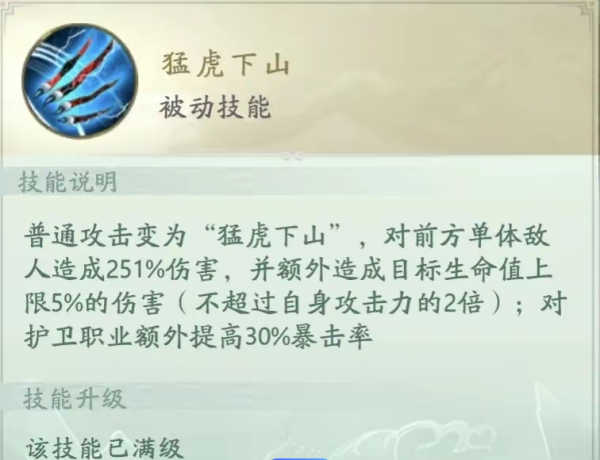 1、白虎是四圣兽之一,非常强大的战士。被动猛虎下山可以对敌人造成伤害同时还附带最大生命值的百分比扣血,如果对手的身份是护卫的话,还会提高20%的暴击率,并且普通攻击就可以触发这个效果。而白虎之影会提高自身的生存性,获得闪避和控制免疫的效果,而闪避成功是将获得自身的治疗,以及虎威效果,此状态下将会拥有额外的联机次数。