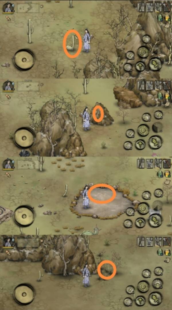音符位置如图,分别为音符形状的仙人掌、石头上的音符痕迹、水潭中的音符波纹以及花丛中的音符(靠近点击音符位置即可收集),距离很近,就在挨饿德不远处,全部收集后回头去找挨饿德。挨饿德说除了音符,还希望我们找到乐谱。