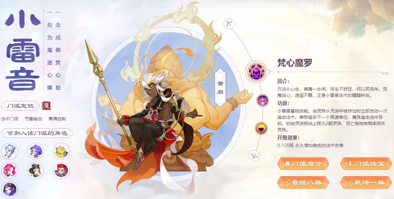 玩法建议:斩业攒珠、一念爆发、度厄保命,法系门派中点杀的翘楚,爆发力极强,但是输出受节奏控制,新手玩家慎入