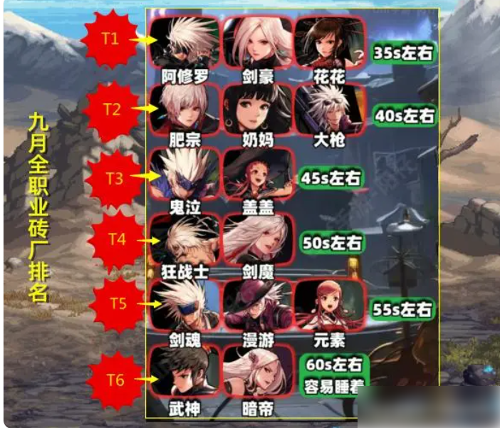 【6】、“T6”下水道梯队,搬砖最难受的职业,武神和暗帝上榜,差不多要60秒左右。