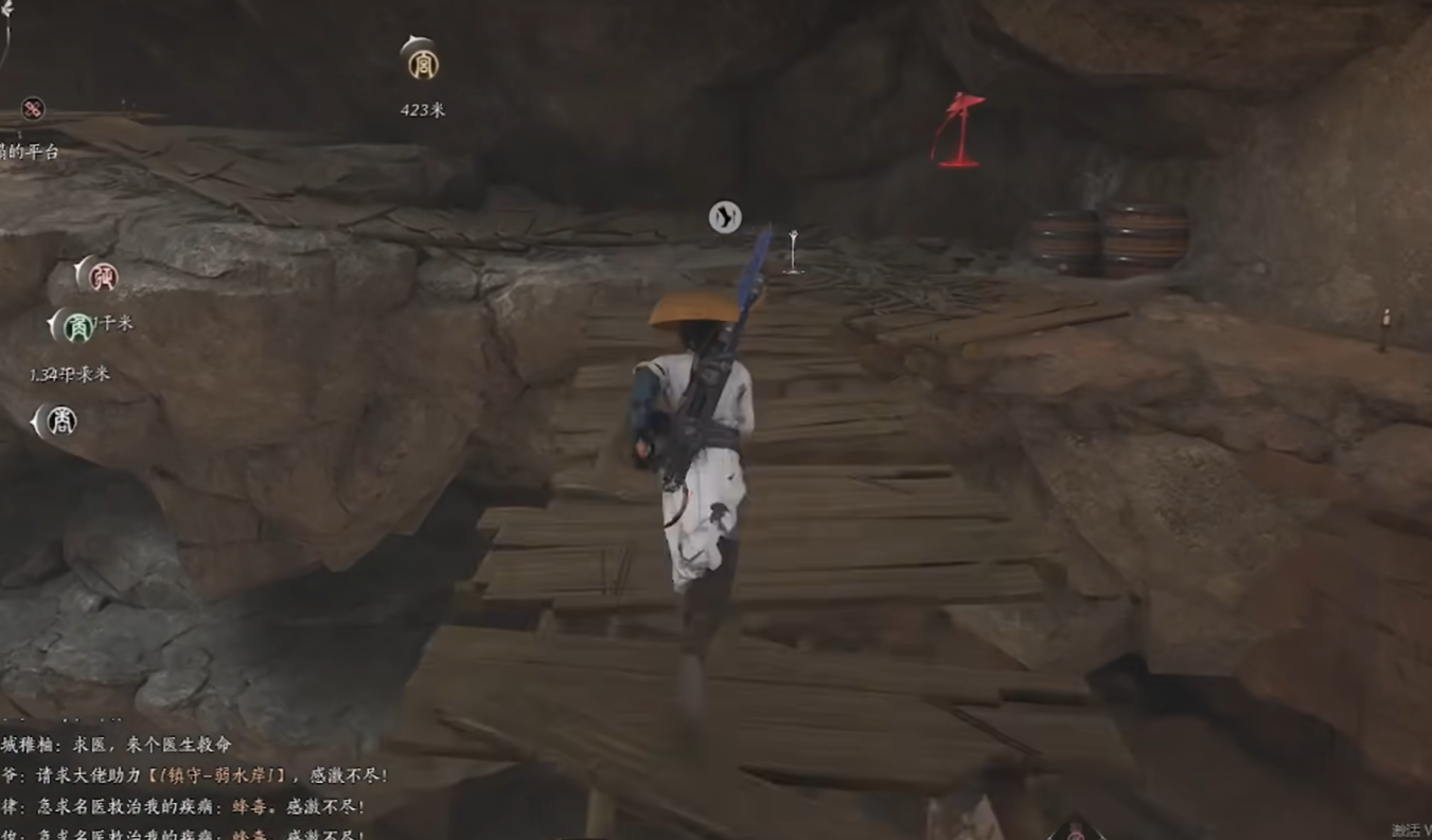 接着我们沿着天井四周的木板以及绳索往下走。