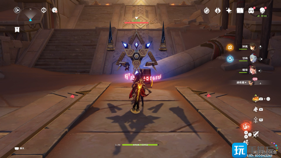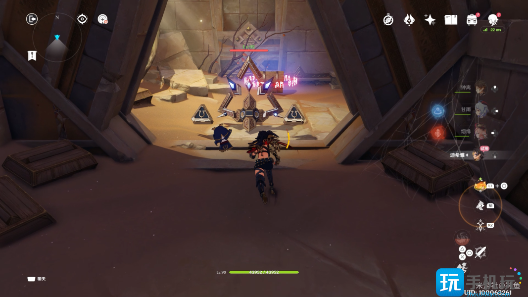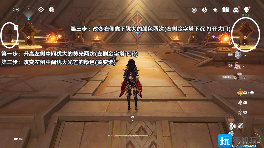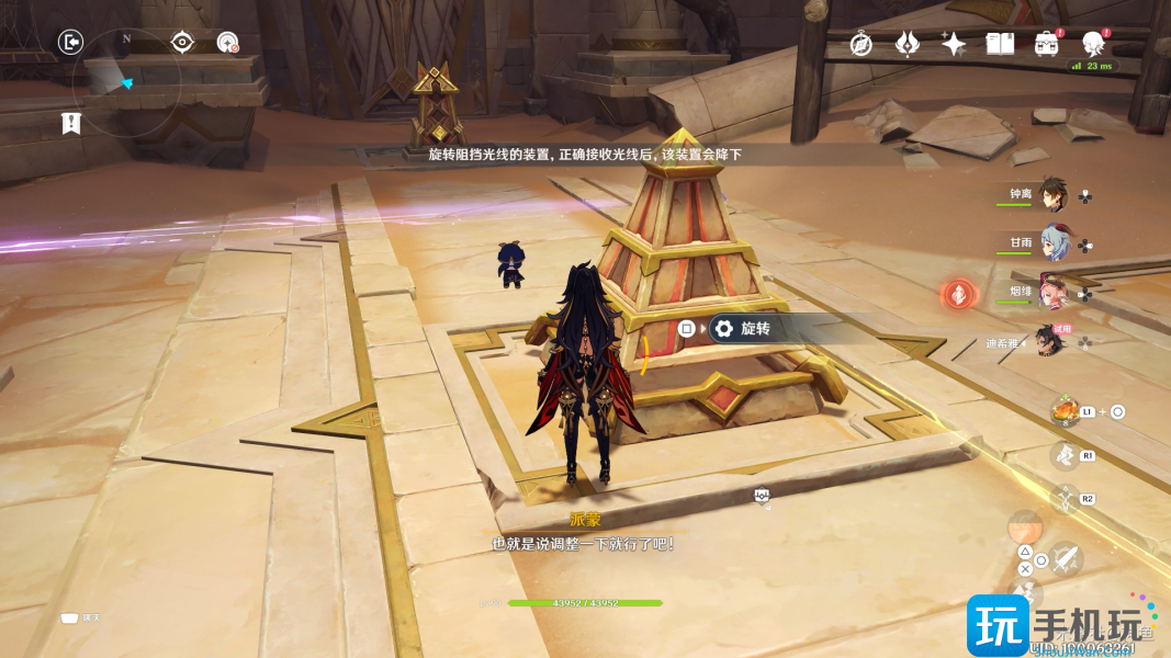 继续前进 派蒙和迪希雅给旅行者提示 先旋转中间的金字塔2次 让紫、黄色的光照到金字塔对应的接收器上 使其下沉