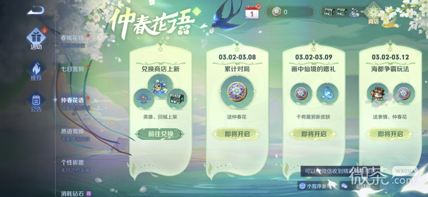 活动期间使用指定英雄参与对局即可领取仲春花!(仲春花可在3月月历商店兑换英雄自选宝箱等好礼!)
