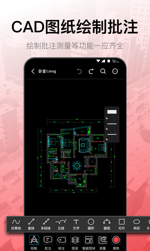 这款软件是工作中不可或缺的好帮手,在手机上即可实现CAD绘制、CAD标注、CAD测量等操作,极大提高了办公效率。绘图工具十分丰富,直线、多段线、云线、圆形、矩形、椭圆等绘制工具一应俱全,还具备文字查找功能,输入关键字,即可一键定位到图纸中的相关内容。