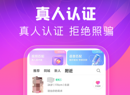 该软件专注于真实信息交友,能通过照片、职业、兴趣标签等资料,帮你高效找寻契合的对象。 “附近” 功能超实用,打开就能看到周围活跃的小伙伴,分分钟就能认识同城新朋友。视频速配功能更是能迅速打破陌生感,大大提高线下见面几率。软件具备全面的隐私保护机制,能全方位保障你的社交安全。