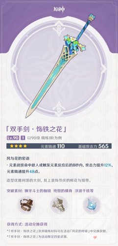第二款武器是饰铁之花,也是需要90级以上才能够使用的武器。本款武器相对上一款的苇海信标低了一个档次,它是四星的武器。元素精通可以有110,然后普通攻击力能够达到565。当元素命中敌人后,能够在八秒内提升攻击力12个点,元素精通也能够提升48个点,这个相对上面的五星武器就没有更多的这个生命加成了,不过对于我们需求不是很高的小伙伴来说,也能够先用拿来用。这个武器的获取方式是通过兑换获得,可以在那个风花的呼吸这个活动中兑换。