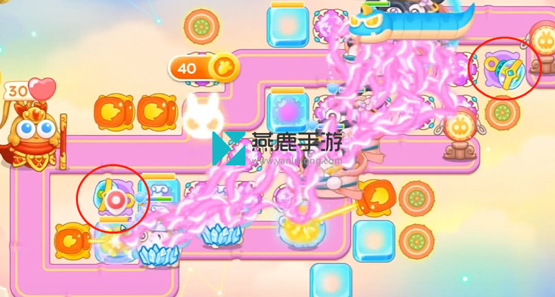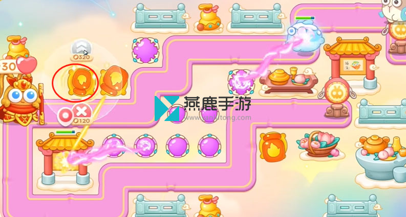 2、左上建立一个火炮,打花篮,花篮打掉之后,空出位置打魔法球,之后继续打酒壶、围栏,打完瞄准钱袋,等最后一只兔子到钱袋上面,打萝卜门。