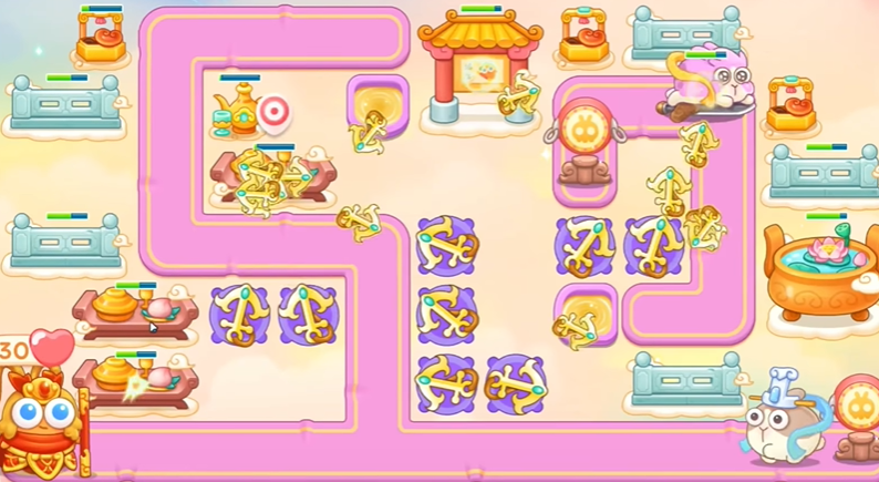 3、建立一个一级船锚,打钱袋,钱袋打掉,空出位置,建立船锚,继续清理周围障碍物,注意第二波有飞天兔,如果船锚没打死,在萝卜附近建立导弹。