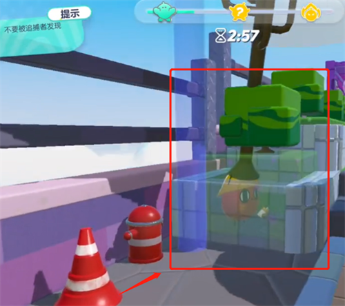 热门点位2:开局选树,走到蓝色柱子边,贴着花坛和柱子变身,树就会被挤压,左右调整就可以让树进入花坛内,再点恢复,但仔就会在花坛下面,也是一个打不到的无敌点,二次变身同样不受影响。这个位置不要选择太大的物体就可以。