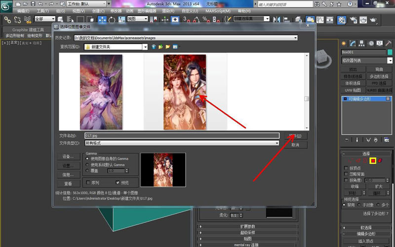 打开材质编辑器,点击窗口中漫反射右边的小方框后,点击位图-确定,调出位图选择窗口