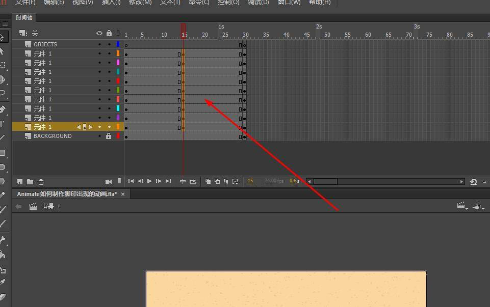 在所有脚印元件图层的第30帧插入关键帧